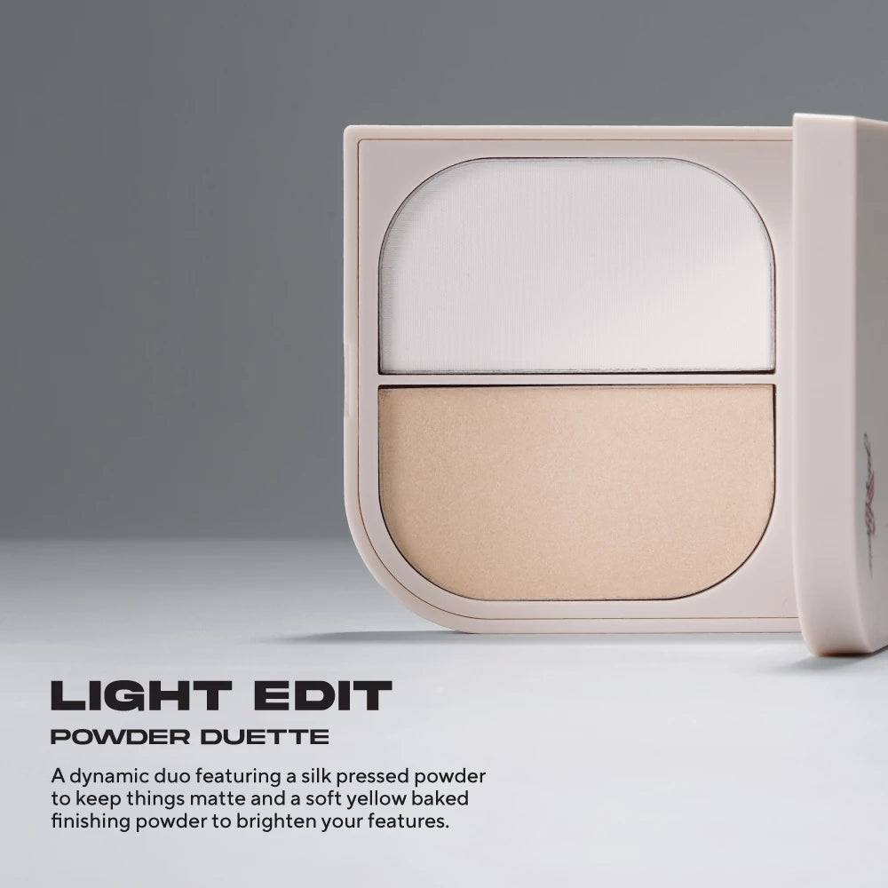 Features a silk pressed powder to keep things matte and a soft yellow baked finishing powder to brighten your features.